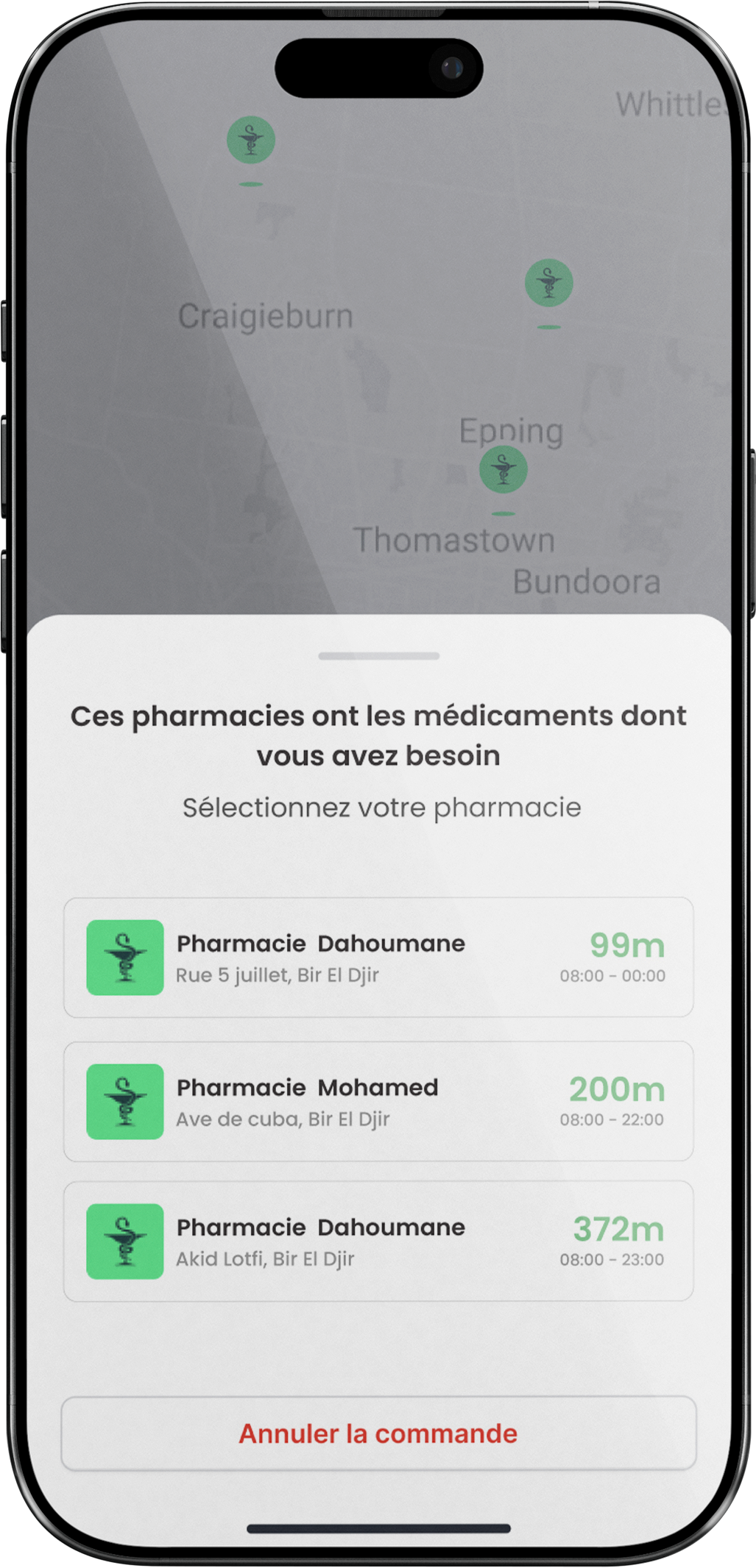 En quelques secondes, vous recevez la liste des pharmacies qui ont tous les médicaments commandés.