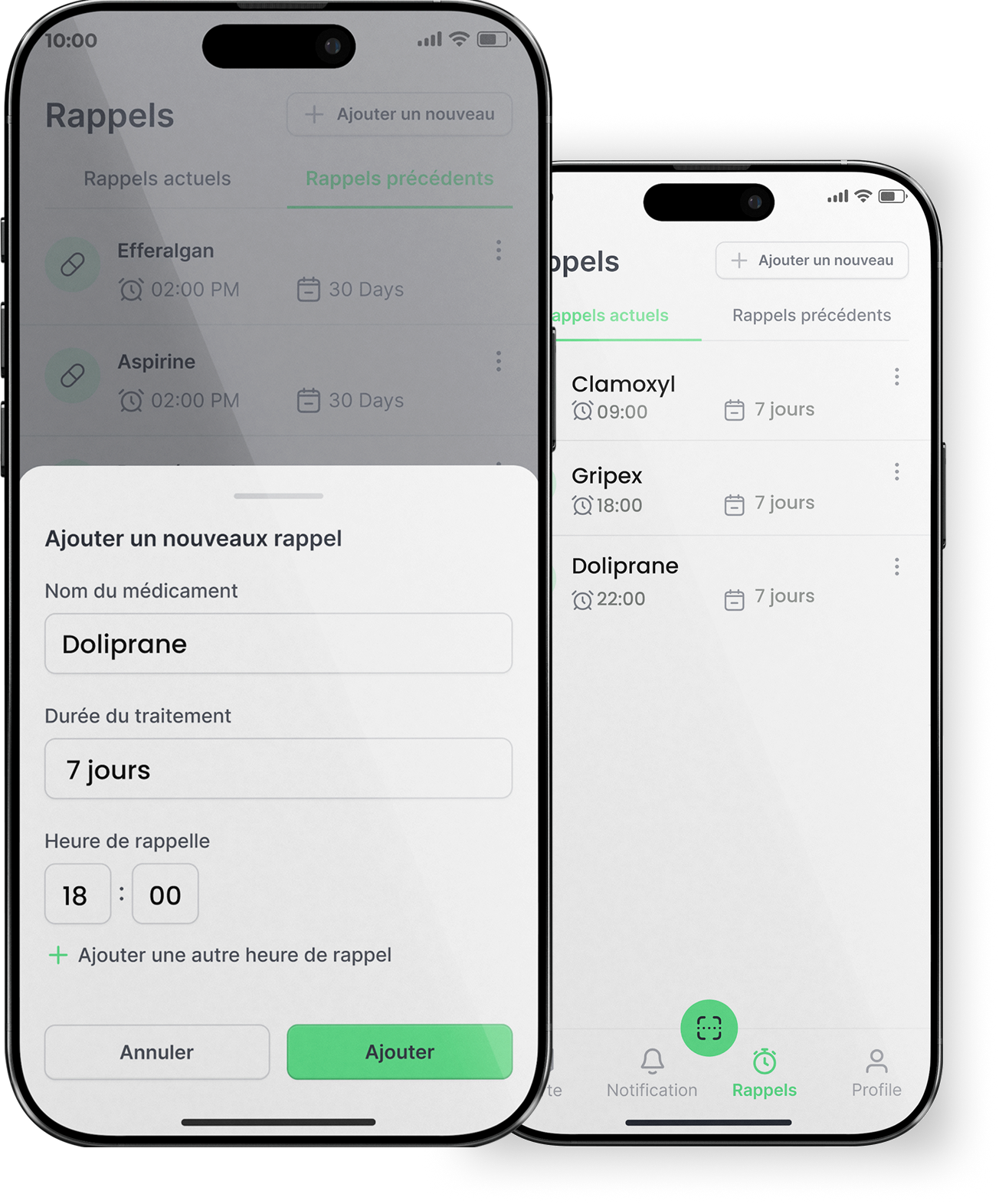 Créez des rappels et recevez des notifications quotidiennes pour prendre vos médicaments à l’heure, sans oubli ni retard.