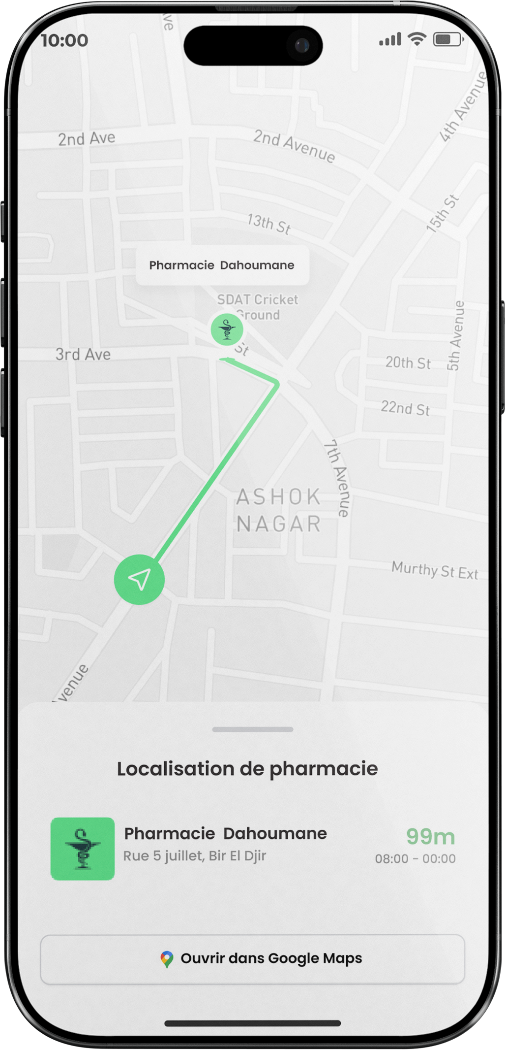 Trouvez facilement et rapidement votre pharmacie grâce à notre carte interactive , qui vous guidera étape par étape jusqu'à votre destination.